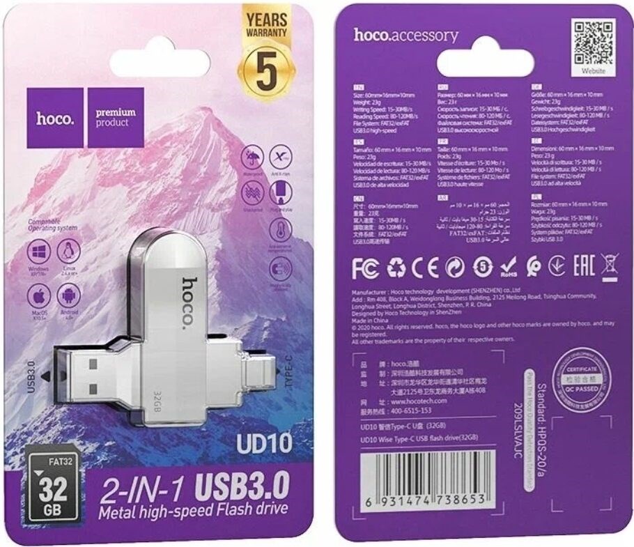 Карта памяти USB Flash HOCO UD10 (3.0) - 32 gd +Type C
