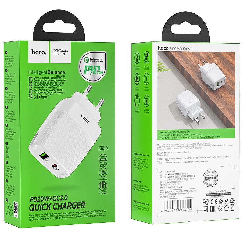 СЗУ Hoco C85A 1 USB + 1 Type-C (PD 20W + QC3.0) (быстрая зарядка)