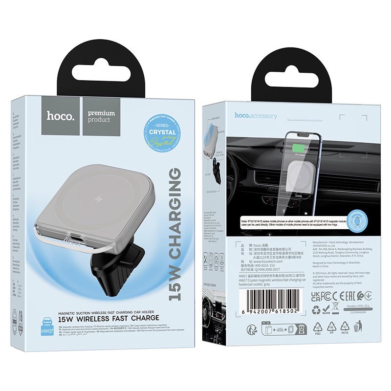 Держатель в автомобиль Hoco HW17 в воздуховод + беспроводная зарядка (15W) (магнитный)