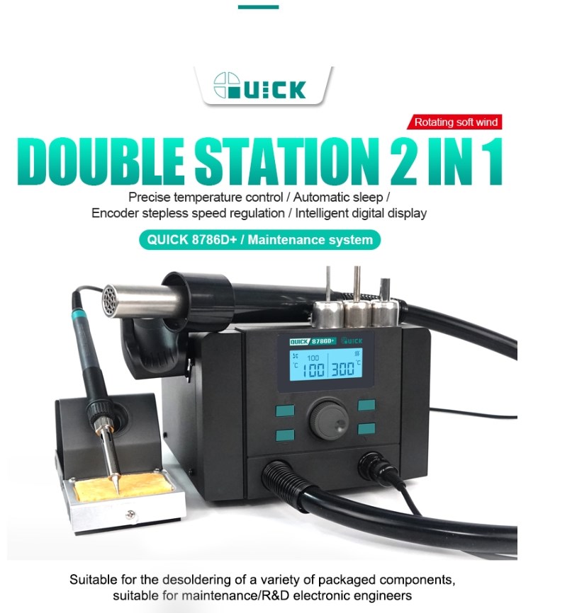 Паяльная станция Quick 8786D+ (макс. мощность термофена 700Вт ,нагнетатель диафрагменный насос,макс. температура термофена 500°C,макс. температура паяльника 480°C)